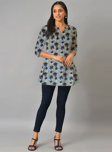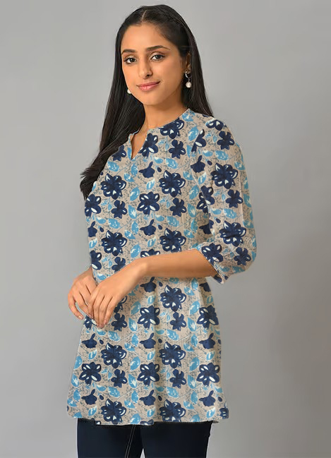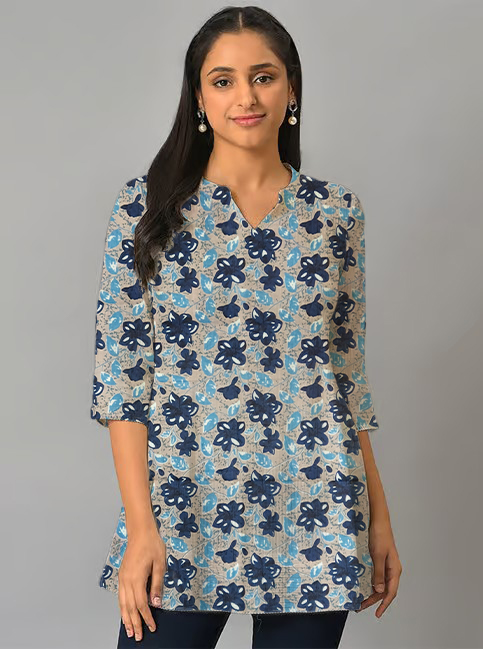 Blue Hibuscus Floral Printed in Geometirc Form Cotton Short Kurti For Womens