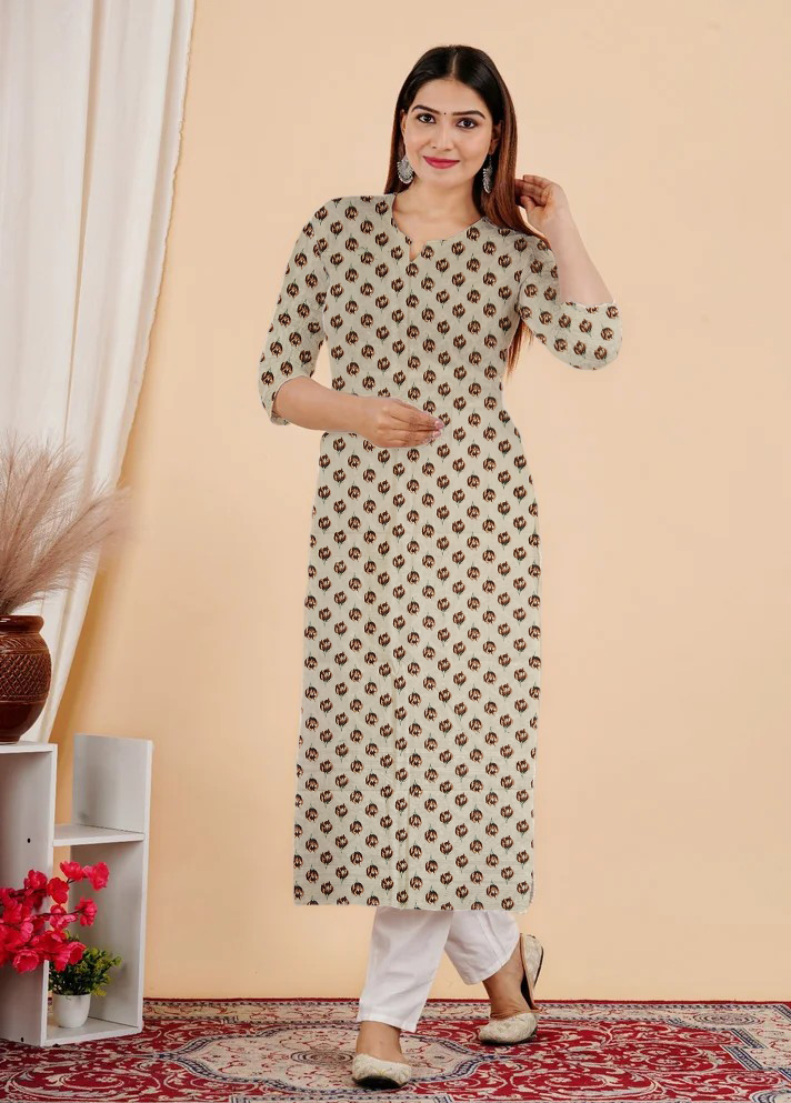 This Kurti look will catch your fancy at a single glance. This Printed Kurti features 3/4th sleeves that adds to its classy look. Besides, the use of Suitable quality Cotton fabric in its making further ensures that you stay comfortable all day long. Pair it with Jeans Pant or Leggis for a cohesive look that exudes confidence.