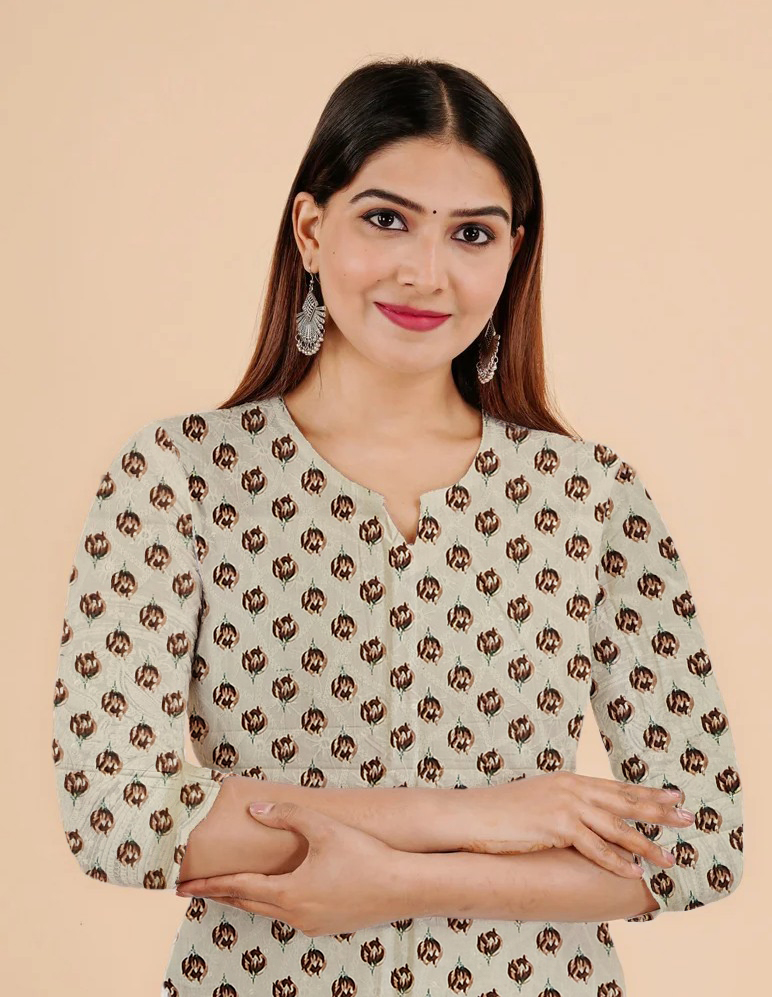 Be the first to review “Brown Small Floral Print in Geometric Form Cotton Kurti For Womens”