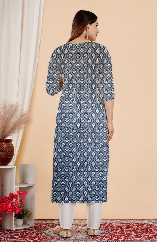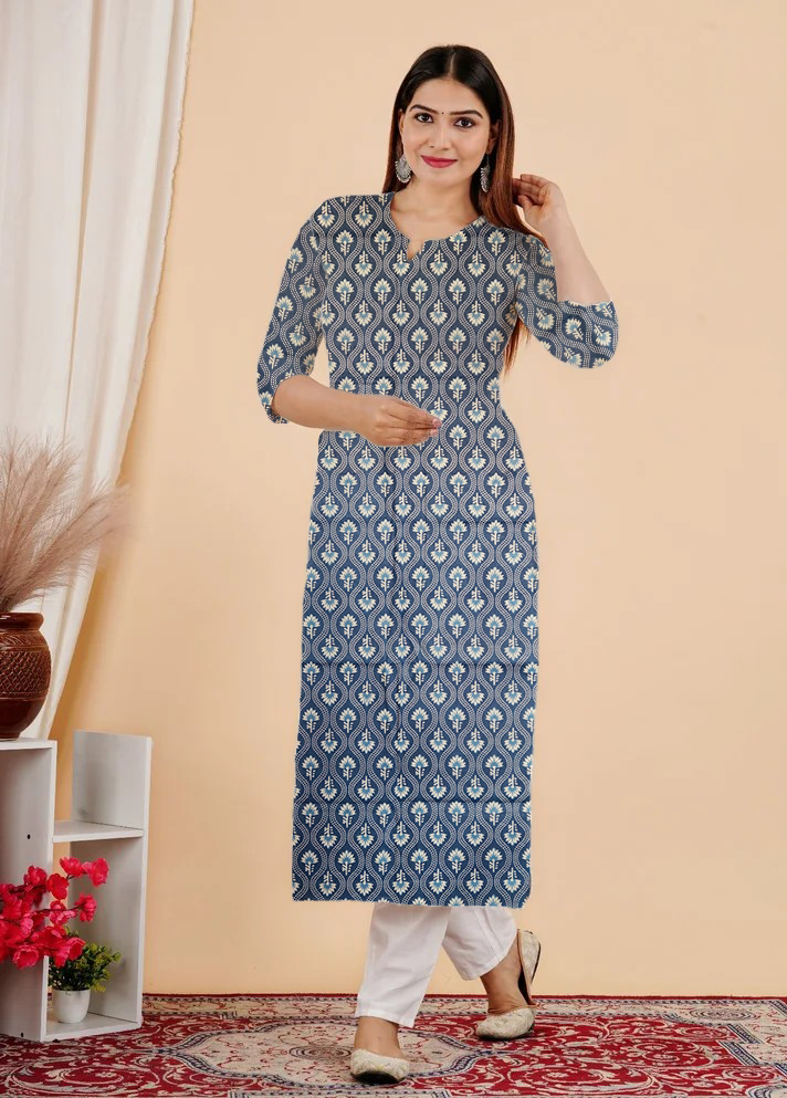 This Kurti look will catch your fancy at a single glance. This Printed Kurti features 3/4th sleeves that adds to its classy look. Besides, the use of Suitable quality Cotton fabric in its making further ensures that you stay comfortable all day long. Pair it with Jeans Pant or Leggis for a cohesive look that exudes confidence.