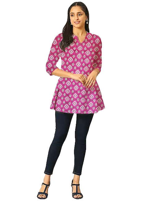 This Short Kurti look will catch your fancy at a single glance. This Printed Short Kurti features 3/4th sleeves that adds to its classy look. Besides, the use of Suitable quality Cotton fabric in its making further ensures that you stay comfortable all day long. Pair it with Jeans Pant or Leggis for a cohesive look that exudes confidence.