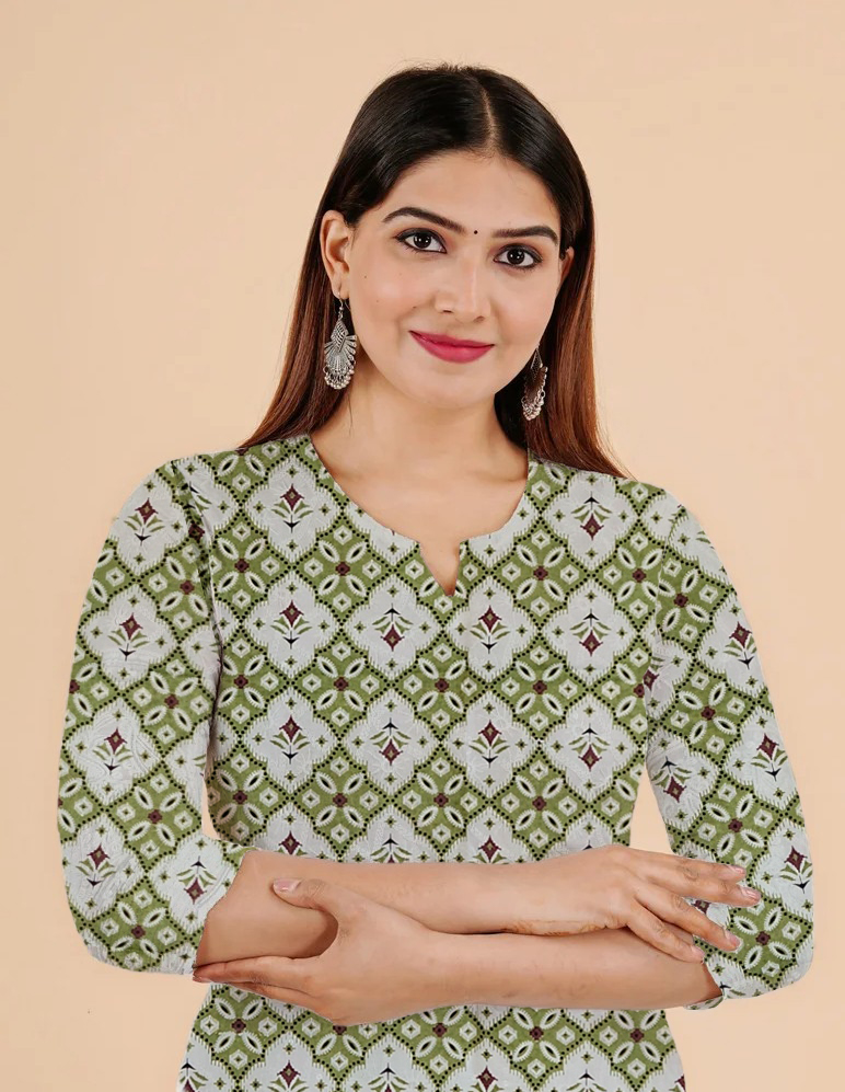 Green Cotton Geometric And Floral Print Kurti For Womens