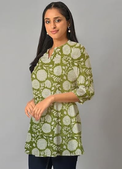 Green Marigold Flower Print Cotton Short Kurti For Womens