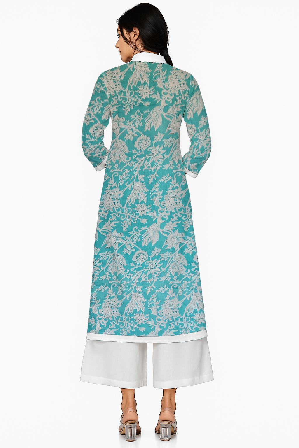 Large Floral Print Blue Cotton Collar Neck Kurti For Womens
