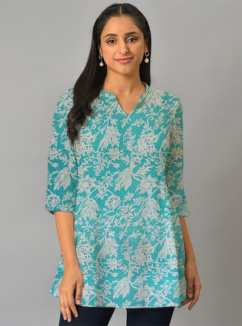Large Floral Print Blue Cotton Short Kurti For Womens