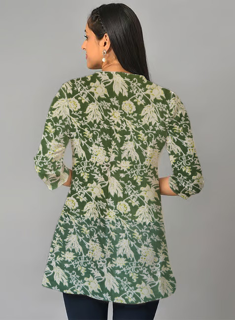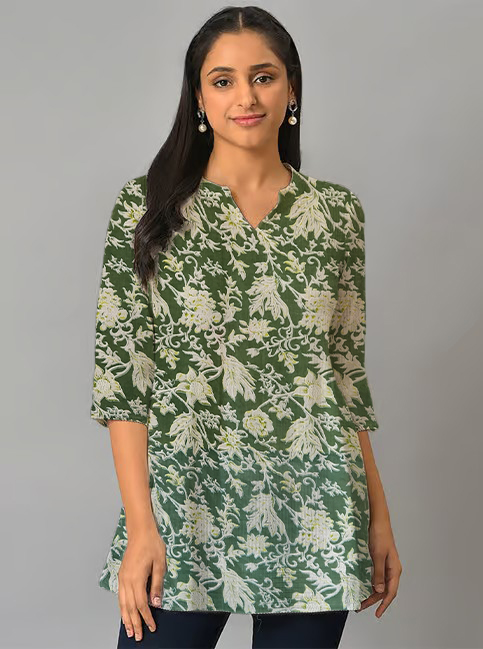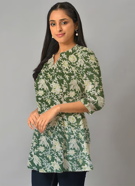 Tiny Floral Printed Green Cotton Short Kurti For Womens