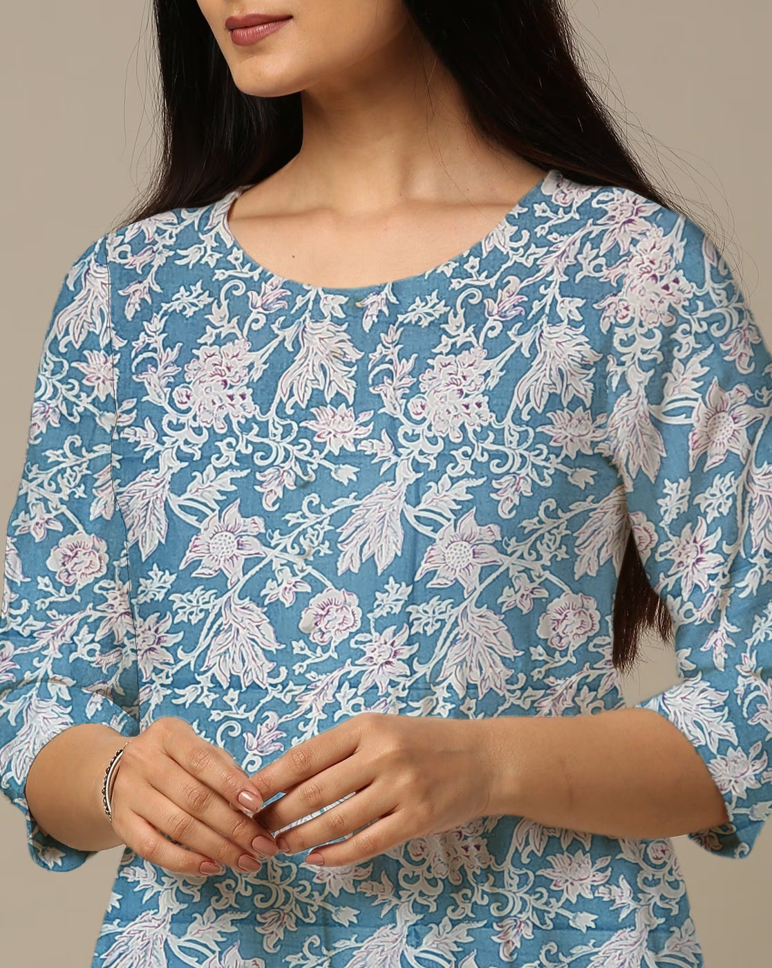 Large Floral Print Steel Blue Cotton Anarkali Kurti For Womens
