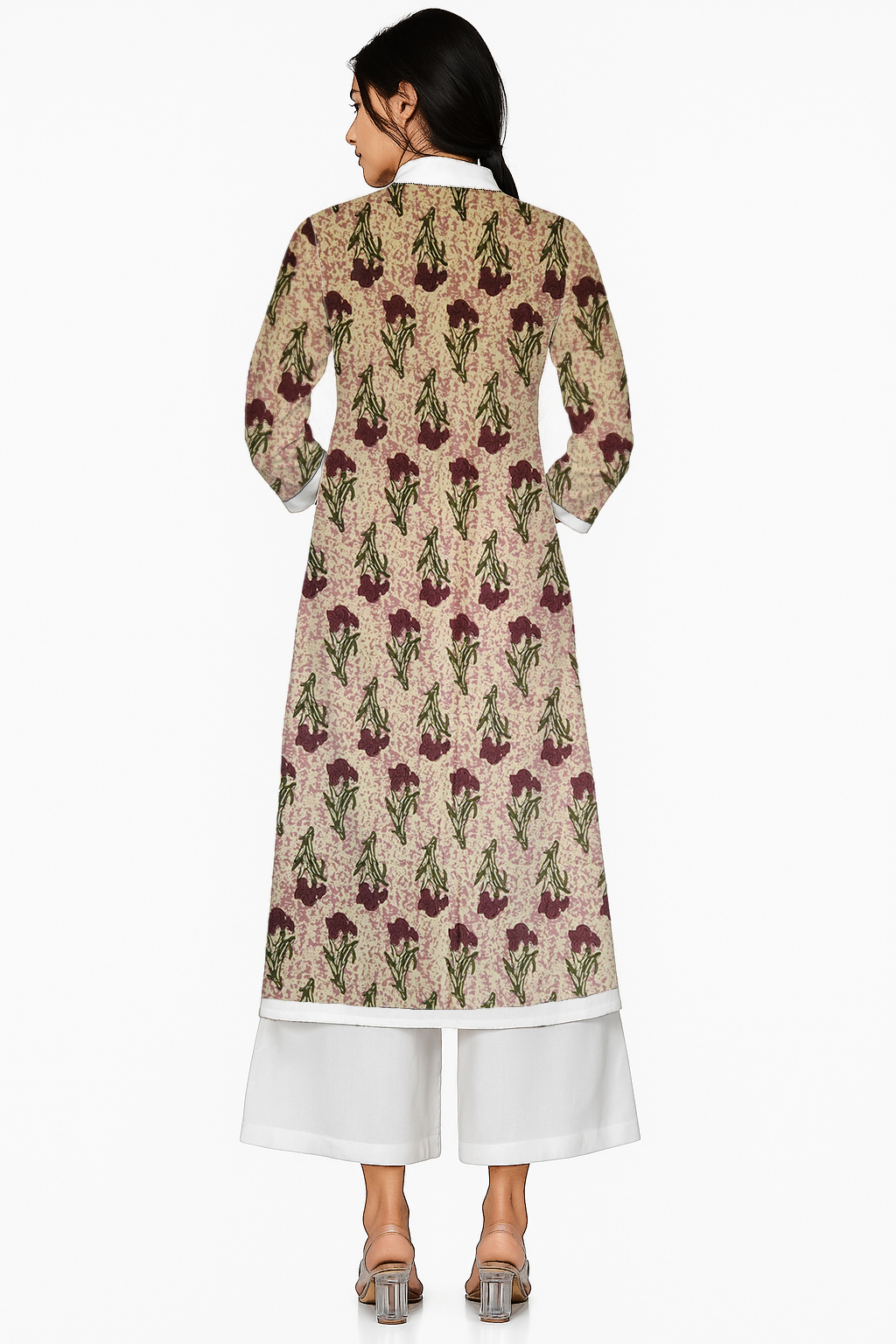 Rosebud Floral Printed Purple Cotton Collar Neck Kurti For Womens