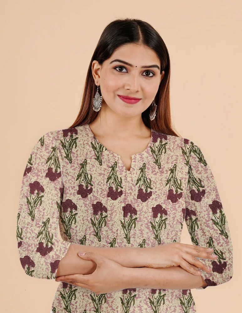 Rosebud Floral Printed Purple Cotton Kurti For Womens