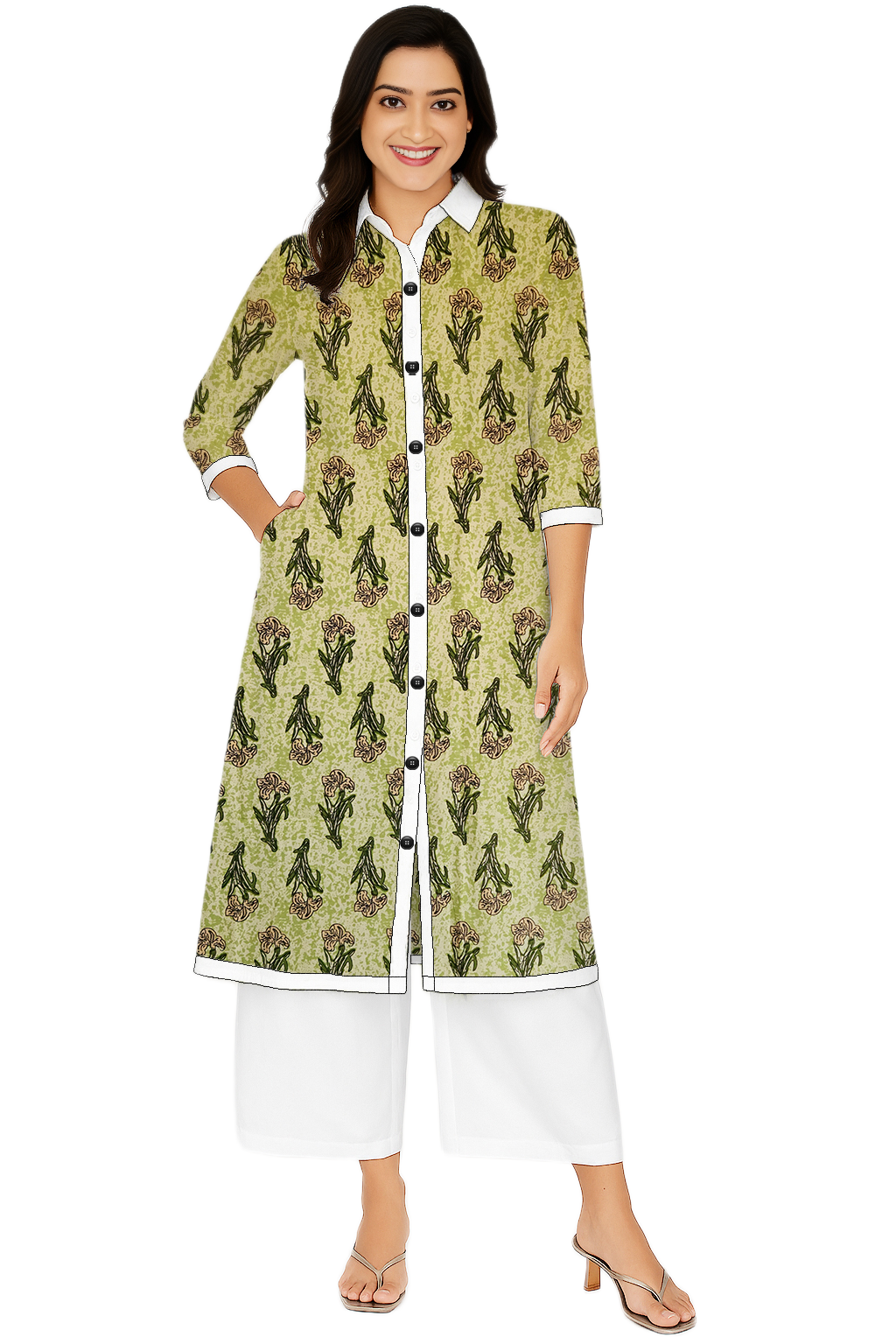 Large Lily Floral Printed Green Cotton Collar Neck Kurti For Womens