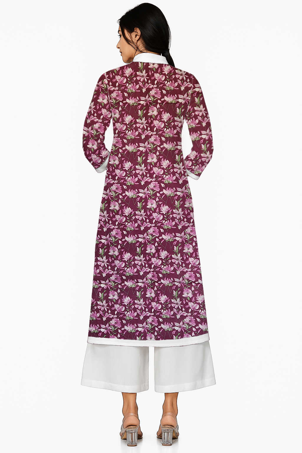 Lily Flower Print Purple Cotton Collar Neck Kurti For Womens