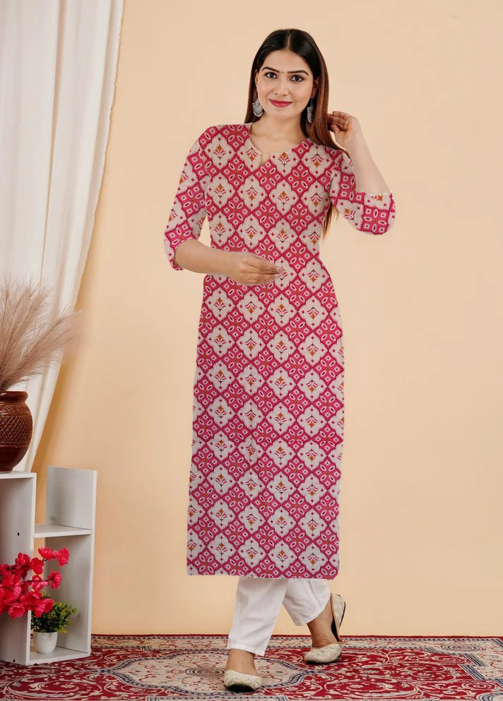 This Kurti look will catch your fancy at a single glance. This Printed Kurti features 3/4th sleeves that adds to its classy look. Besides, the use of Suitable quality Cotton fabric in its making further ensures that you stay comfortable all day long. Pair it with Jeans Pant or Leggis for a cohesive look that exudes confidence.