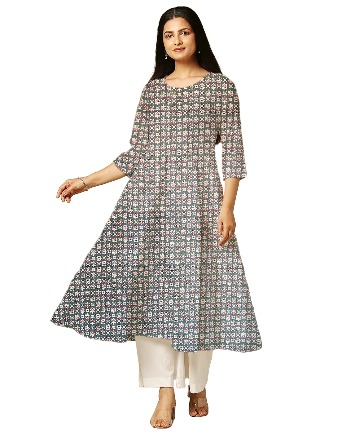 Lily Flower Print Blue Cotton Anarkali Kurti For Womens