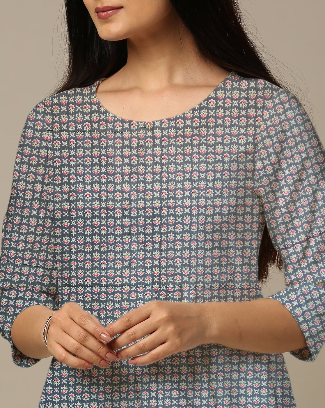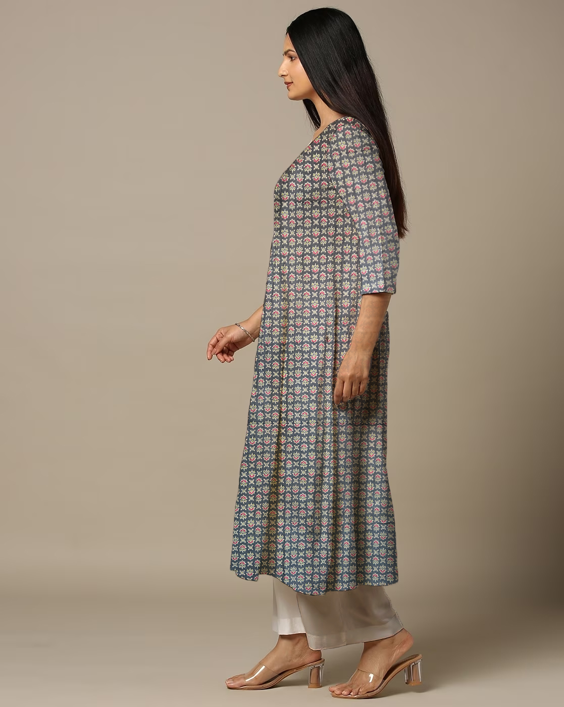 This Anarkali Kurti look will catch your fancy at a single glance. This Printed Anarkali Kurti features 3/4th sleeves that adds to its classy look. Besides, the use of Suitable quality Cotton fabric in its making further ensures that you stay comfortable all day long. Pair it with Jeans Pant or Leggis for a cohesive look that exudes confidence.