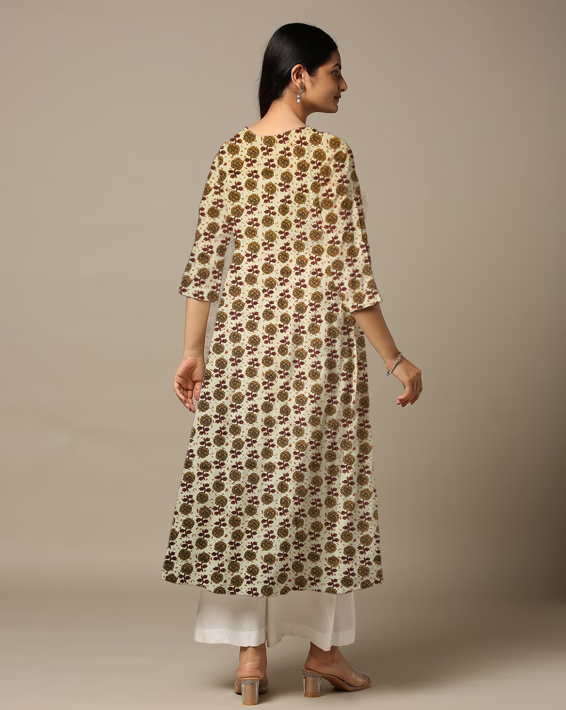 This Anarkali Kurti look will catch your fancy at a single glance. This Printed Anarkali Kurti features 3/4th sleeves that adds to its classy look. Besides, the use of Suitable quality Cotton fabric in its making further ensures that you stay comfortable all day long. Pair it with Jeans Pant or Leggis for a cohesive look that exudes confidence.