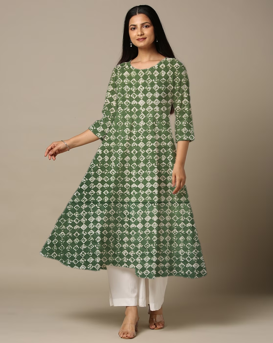 Square Print Green Cotton Anarkali Kurti For Womens