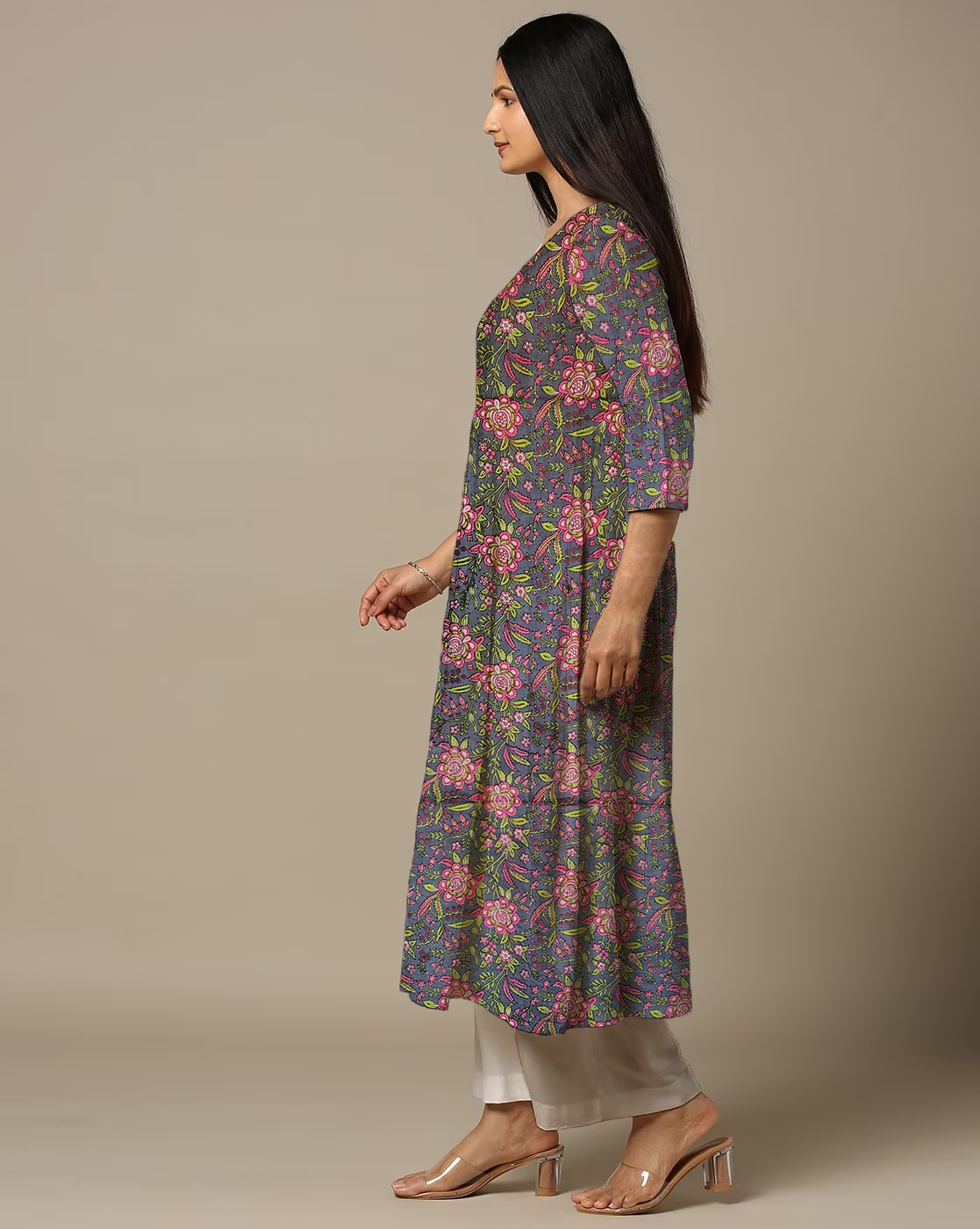 This Anarkali Kurti look will catch your fancy at a single glance. This Printed Anarkali Kurti features 3/4th sleeves that adds to its classy look. Besides, the use of Suitable quality Cotton fabric in its making further ensures that you stay comfortable all day long. Pair it with Jeans Pant or Leggis for a cohesive look that exudes confidence.