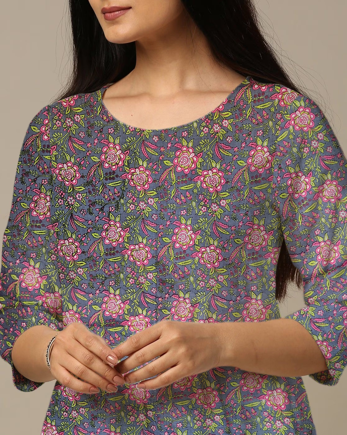 Small Floral Print Purple Cotton Anarkali Kurti For Womens