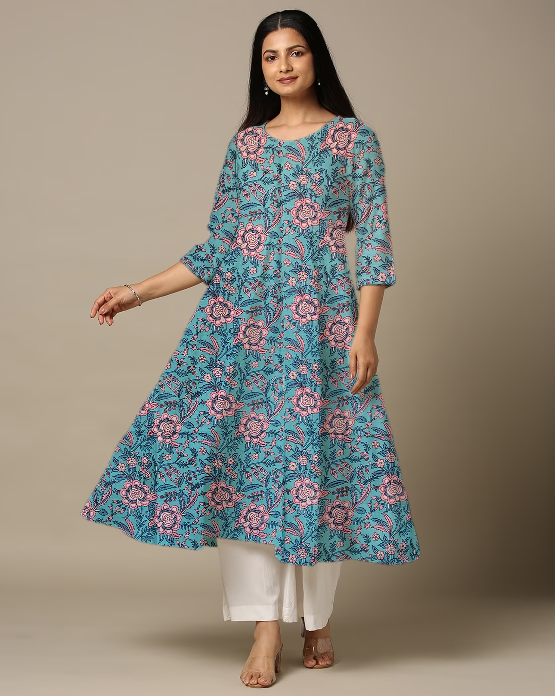 Sun Flower Print Sky Blue Cotton Anarkali Kurti For Womens