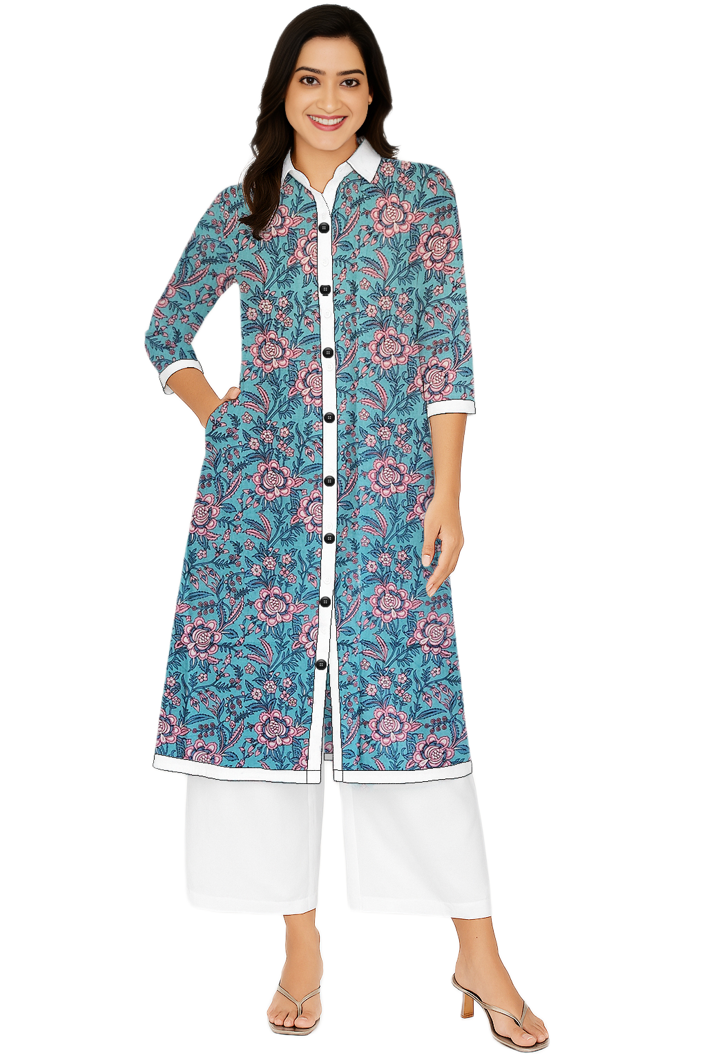 Be the first to review “Sun Flower Print Sky Blue Cotton Collar Neck Kurti For Womens”