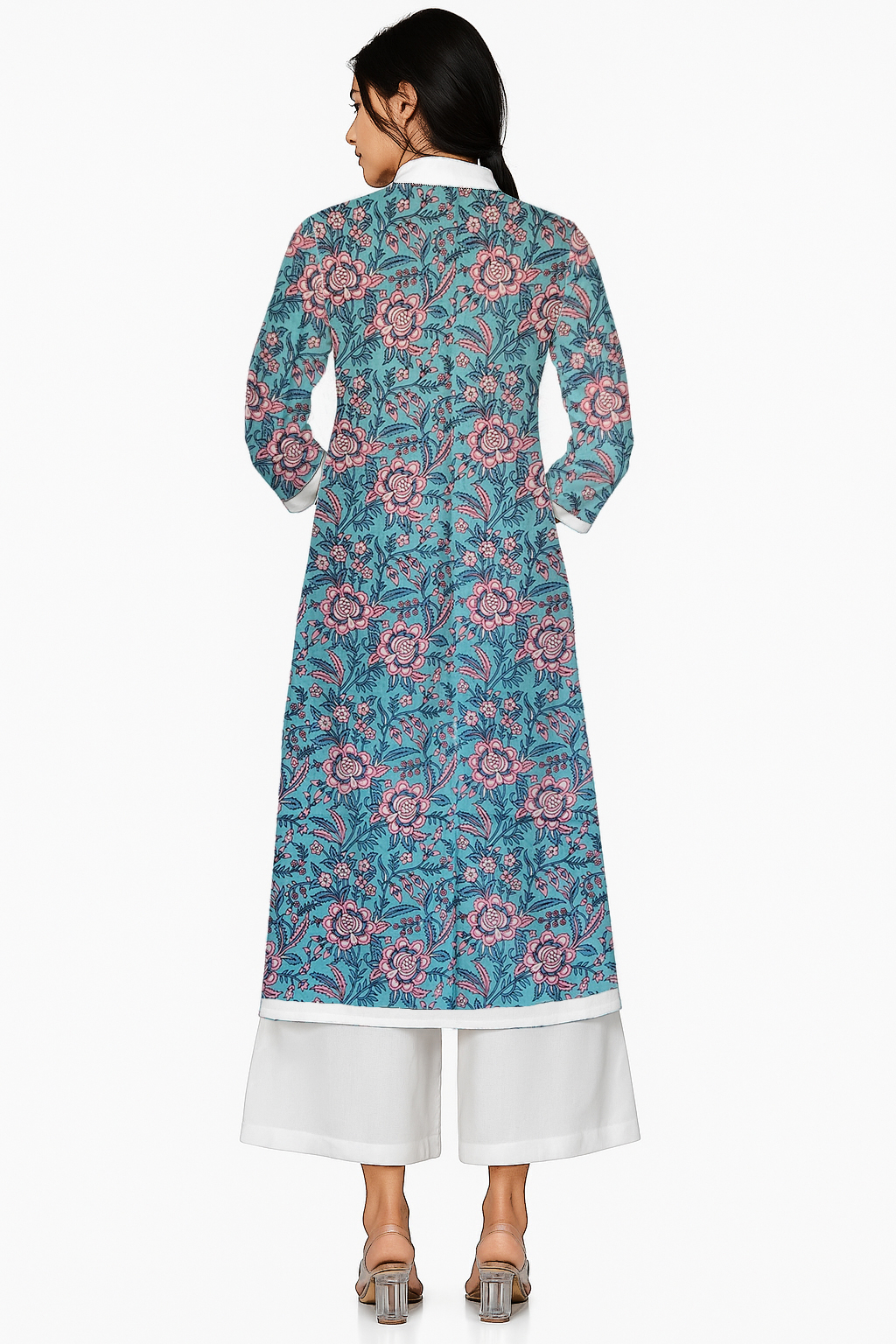 Sun Flower Print Sky Blue Cotton Collar Neck Kurti For Womens