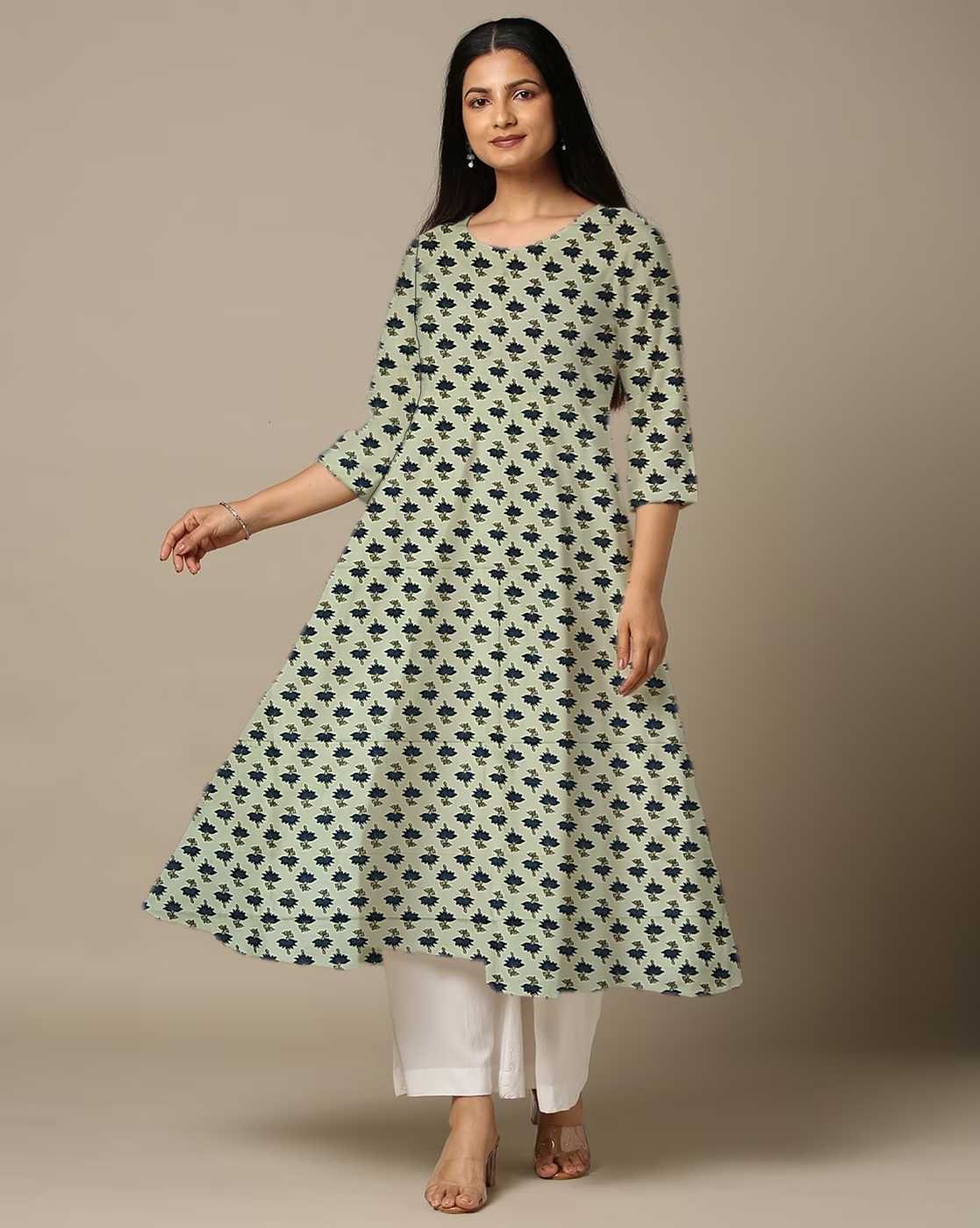 This Anarkali Kurti look will catch your fancy at a single glance. This Printed Anarkali Kurti features 3/4th sleeves that adds to its classy look. Besides, the use of Suitable quality Cotton fabric in its making further ensures that you stay comfortable all day long. Pair it with Jeans Pant or Leggis for a cohesive look that exudes confidence.